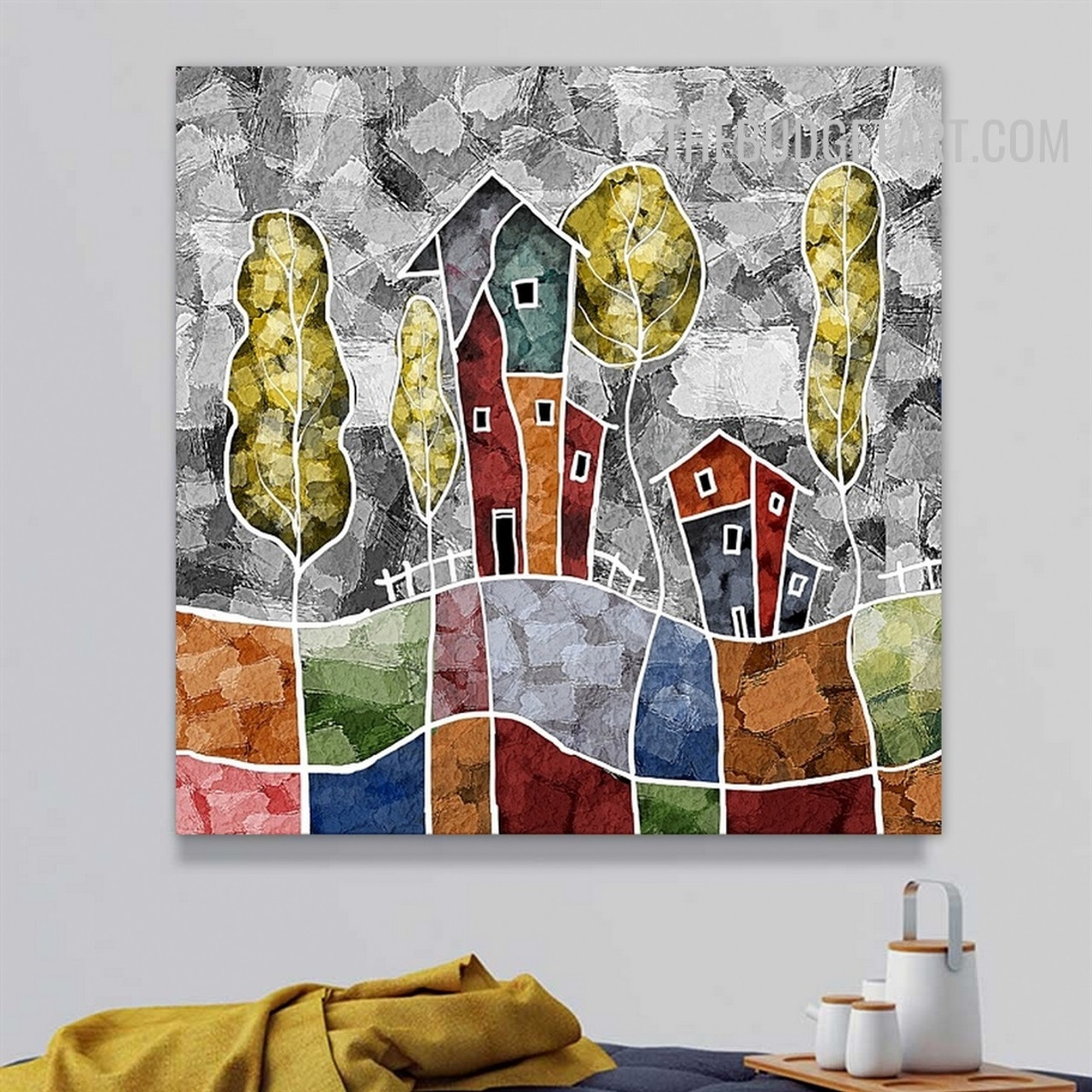 "House Tree" takes a more abstract approach, blending the geometric with the organic. This painting combines bright houses with trees, thus neutralising the division between nature and art. The trees are free-form, yet the houses are structured, providing an interesting balance to the work. It’s a wonderful exploration of the relationship between architecture and nature, where both elements coexist in harmony.