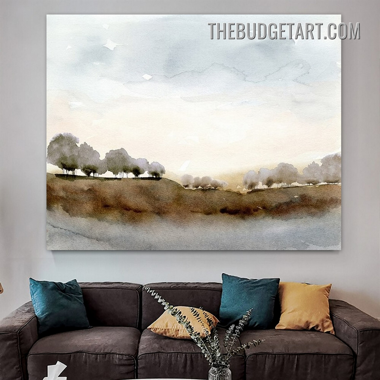 This landscape wall art print offers a lovely abstract watercolor painting of hills, trees, and clouds in the foreground with stigmas. The brilliant colors and gentle brushstrokes create a dreamlike ambience to complement the decor of any area.
