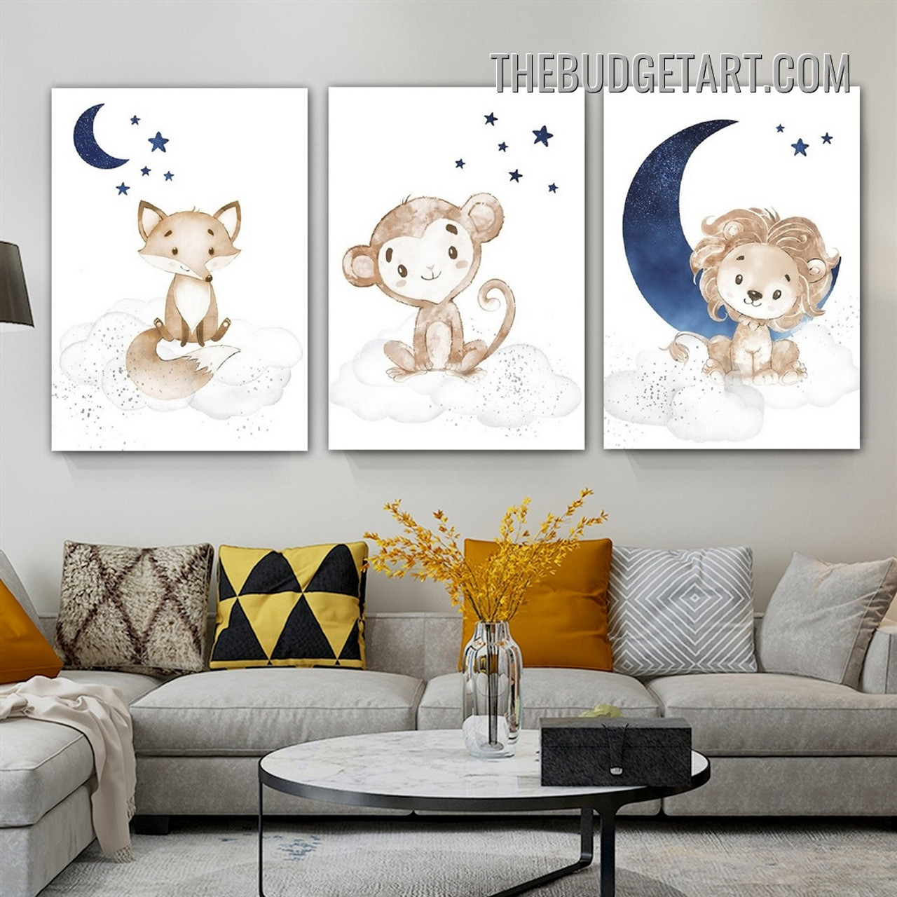Monkey Scandinavian Prints will add a humorous touch to your child's room. These minimalist kids wall art options consist of cute infant animal cartoons such as monkeys, foxes, and lions against starry night skies full of moons, clouds, and amusing dots. These watercolour canvas prints offer a magical touch to any child's room.