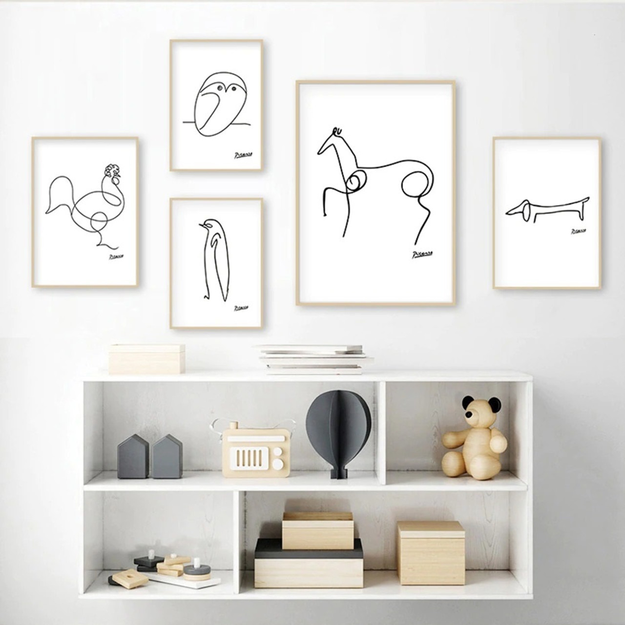 The intriguing Hackney Contour Wall Art will transform your child's room. This collection of 5 canvas prints, which features a delightful assortment of animals in a whimsical curving line design, can add a touch of minimalist sophistication to any nursery or playroom, making it the ideal addition for instilling joy and creativity into your child's world.